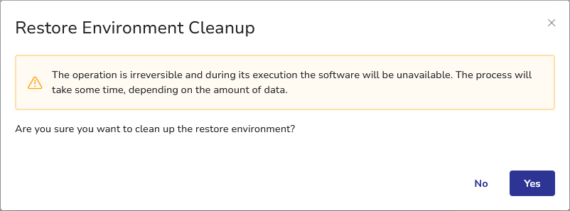 - The Restore Environment Cleanup dialog will display. Click Yes to start the cleanup process. It will take some time depending on the amount of data.