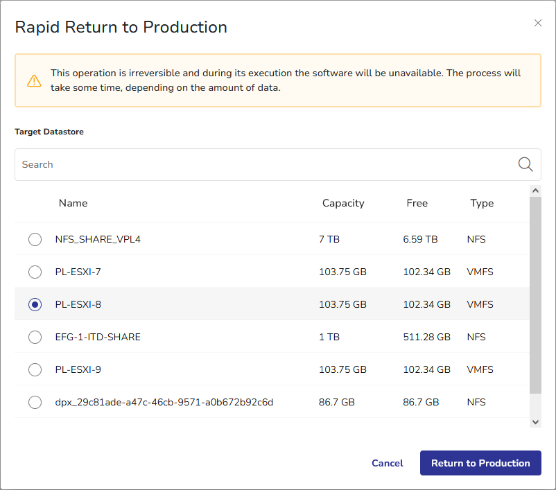 - The Rapid Return to Production dialog will display. Select target datastore. You can use the search bar to find the desired item. The search is case-insensitive.