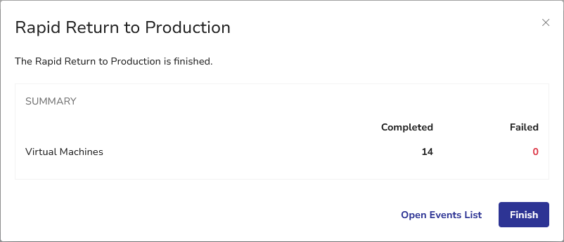 When the process is finished, the summary dialog will show the RRP results. If all VMs are returned to production successfully, the Multi-VM Restore job item will disappear from the Unfinished Restores view.