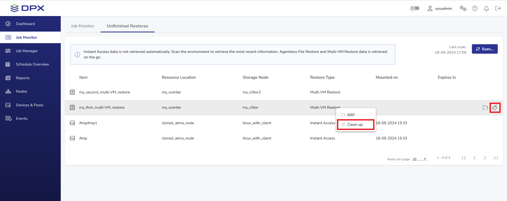 The cleanup feature allows the user to remove temporarily restored VMs from vCenter. It can be useful when all necessary files have been retrieved from the VMs and returning the VMs to production is not required.
