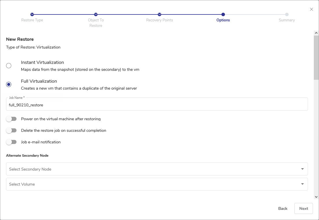 In all previous steps of creating a restore job, the available selections were based on the backup metadata stored on DPX. This means that DPX is aware of all backups made by the user and where they are stored. If, during backup or at a later stage, the backup data have been replicated to a secondary location and the primary location becomes corrupt or inaccessible, you can choose to restore your data from such secondary location using this option.