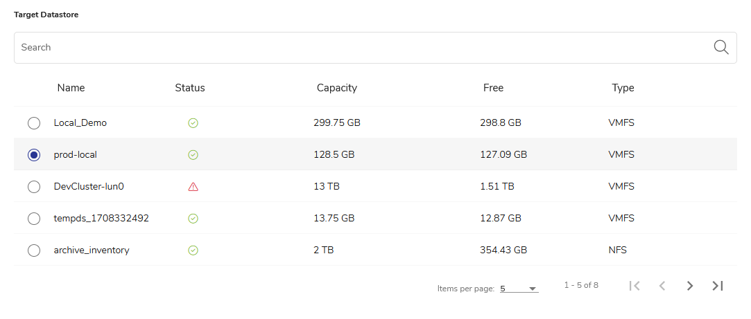 - Select Target Datastore. Use the Search input field or select one of the available datastores from the list.