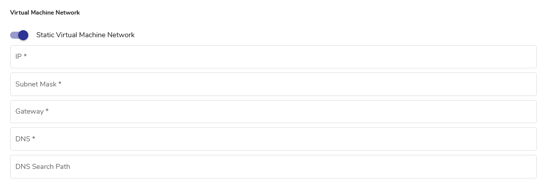 - (Optional) By default, the Static Virtual Machine Network toggle is in the disabled position. When enabled, additional fields are shown.