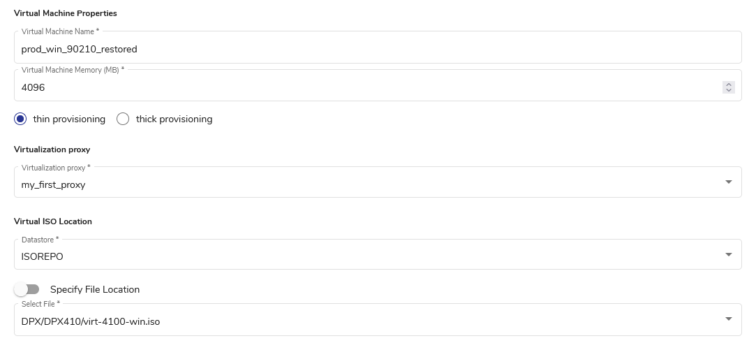 - Indicate the Virtual ISO Location. You will need a virtualization ISO of the operating system required for your machine (Linux or Windows). Normally, you will obtain it from the appropriate MySupport DPX Virtualization Support section. If in doubt, contact our Technical Support team.