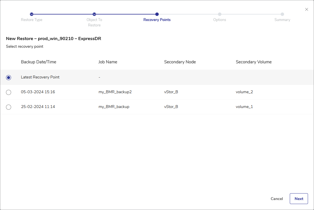 - From the list of recovery points of the VM object, select the desired recovery point. By default, Latest Recovery Point is selected. Click Next.