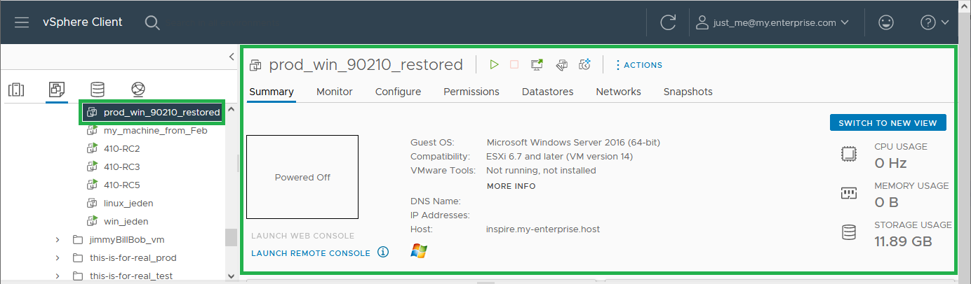 After a successful job run, the restored virtual machine will be visible in the vCenter:
