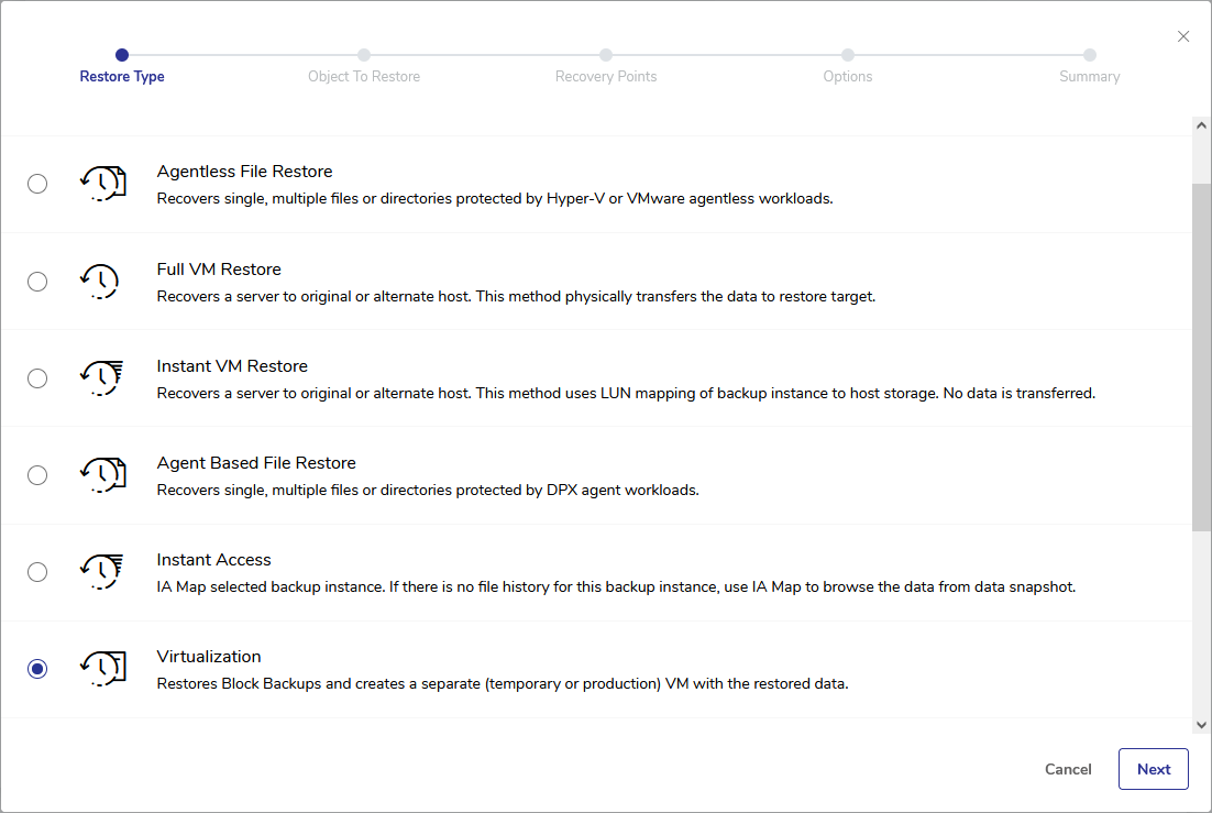 Virtualization is the process of restoring Block backups by creating a separate virtual machine with the restored data. Such restore process requires BMR backups. The virtualization itself may be instant or full. Full Virtualization creates a production VM. Instant Virtualization creates a temporary VM, which is typically used for setup or testing purposes. In addition, you can convert the temporary VM that were created with Instant Virtualization into a production VM by using the Rapid Return to Production (RRP) feature.