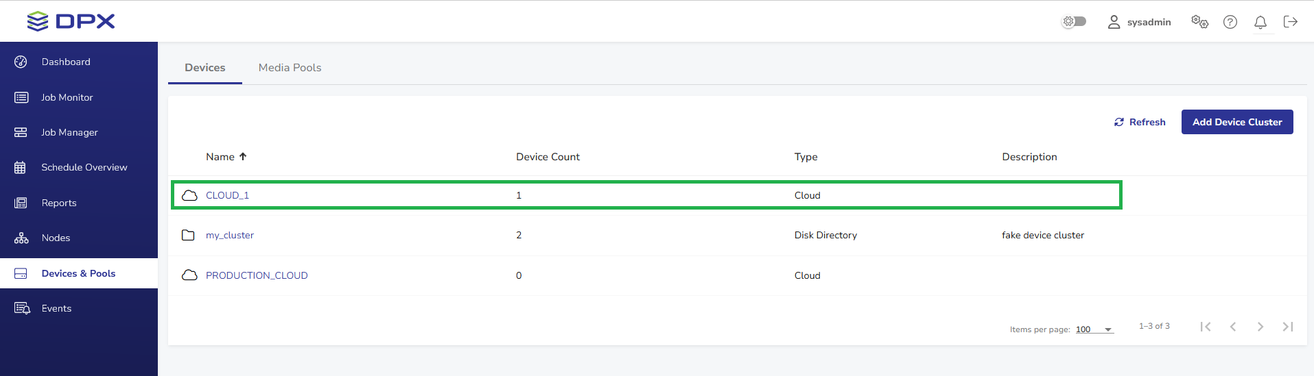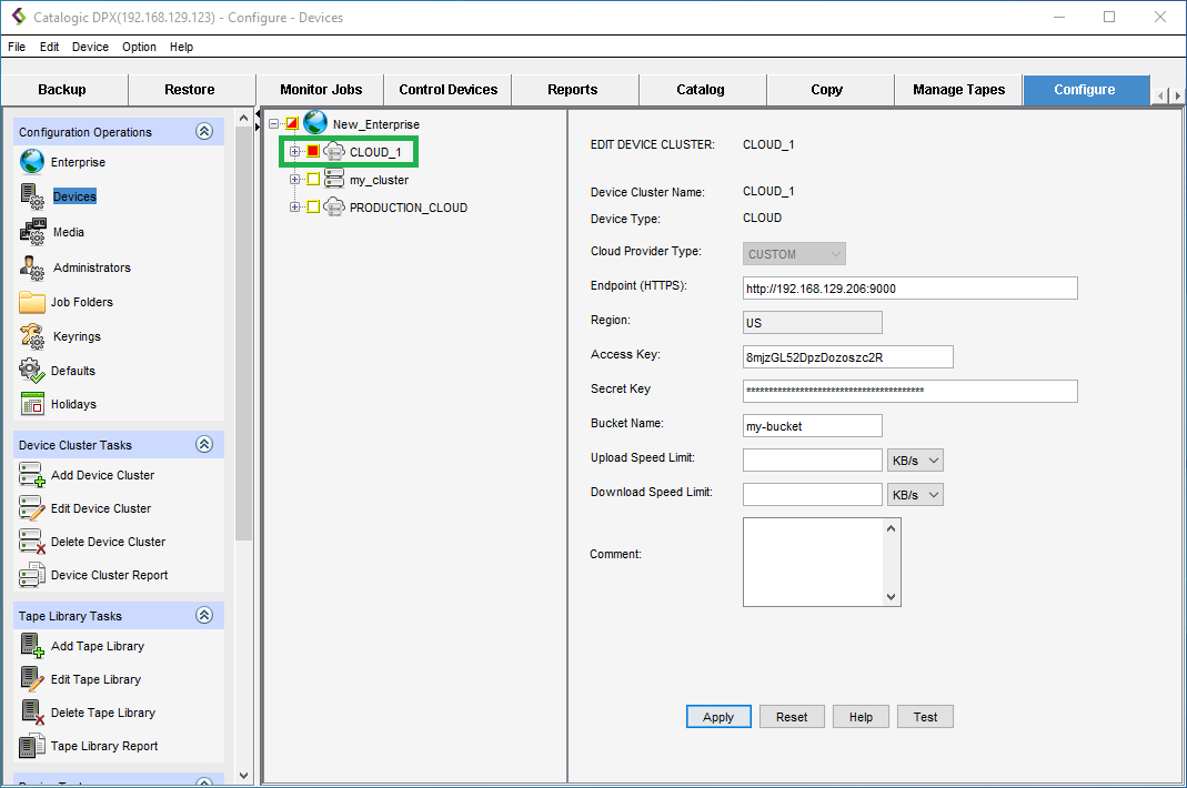 A device cluster is a logical grouping of non-tape library (standalone) backup devices. Catalogic DPX supports the following cloud providers: MinIO, StorageGRID, Cloudian, Wasabi, and Scality RING. Follow these steps to add and configure one of these cloud providers for Agentless VMware backups or Block archiving.