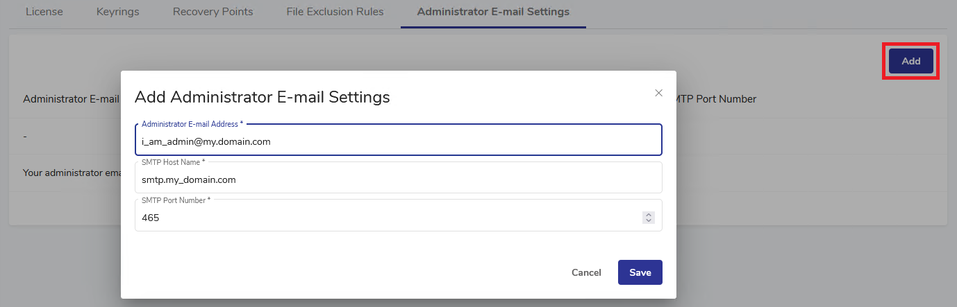 The Add Administrator E-mail Settings dialog will appear.