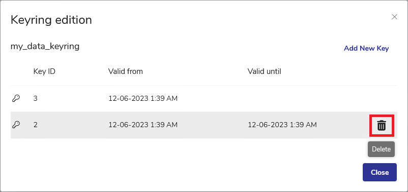 To delete a key within a keyring, hover over the record of the key and click the Trash icon on the left. You will be prompted to confirm your decision.