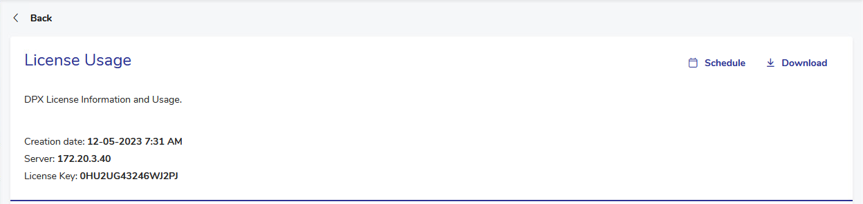 The License Report button at the very bottom of this section is used do display a detailed report on the DPX Master Server license and usage. The report can be viewed, downloaded or scheduled for being generated as a .pdf or .csv file in certain intervals or at certain points in time.