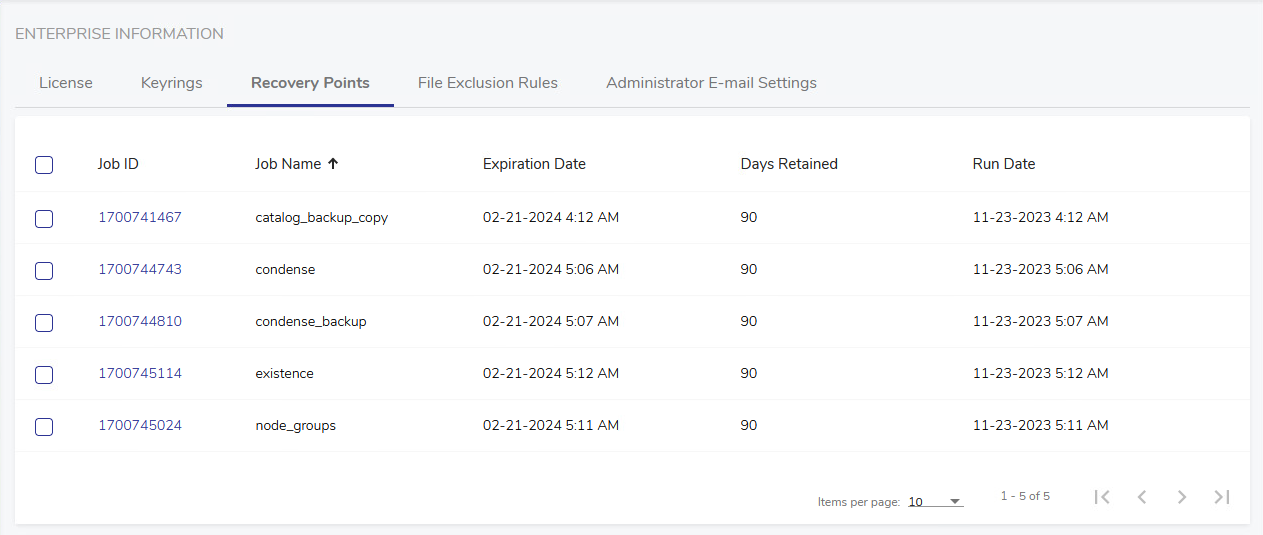 You can control the recovery points view by ordering items by Job ID, Job Name, Expiration Date, Days Retained and Run Date, ascending or descending. Note also the Items per page value which can be useful when managing the display.