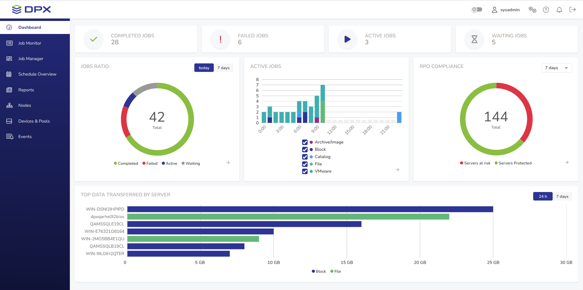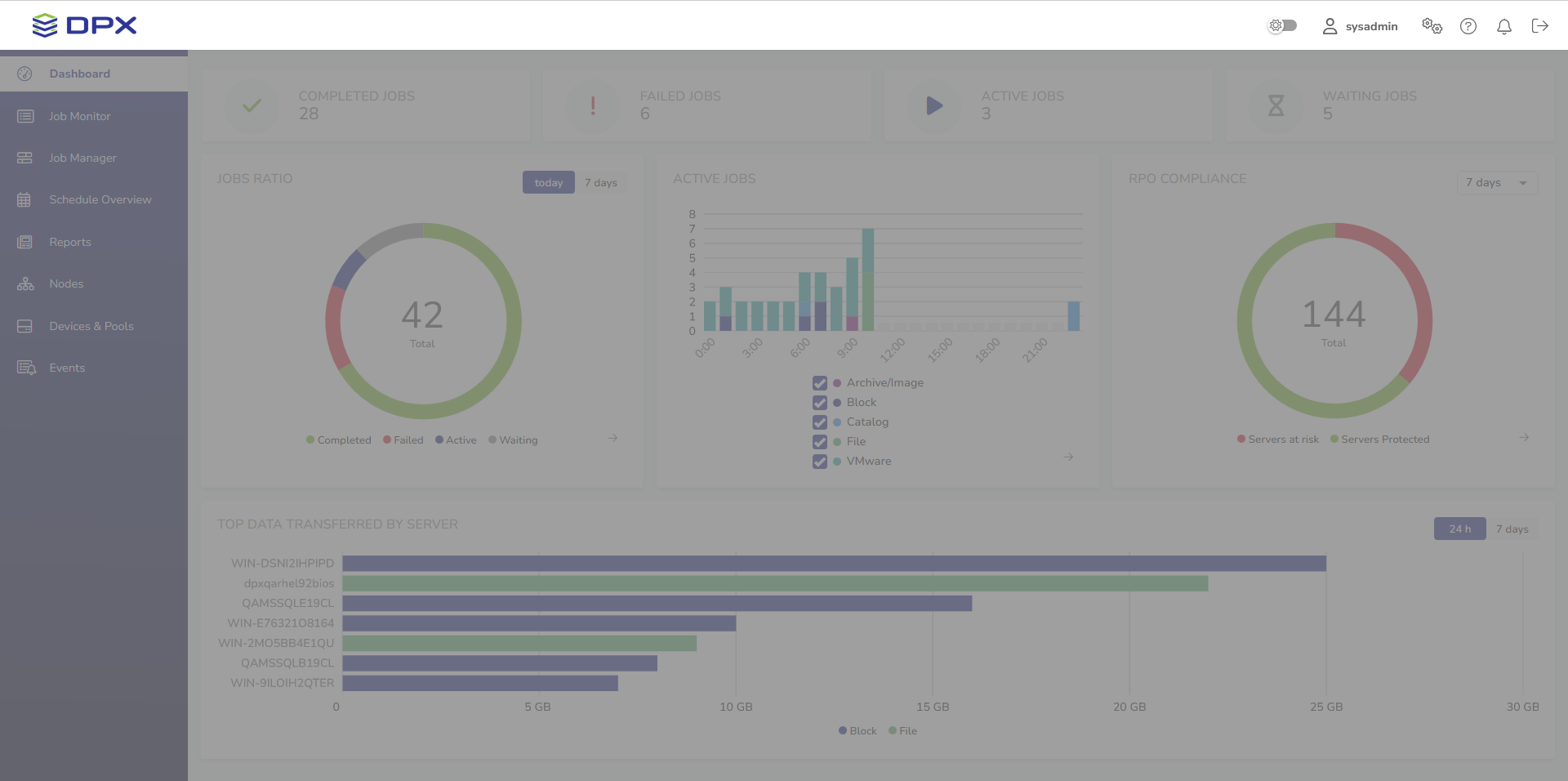 After successful login, the DPX dashboard is shown. Its main part presents an overview of the DPX’s performance.