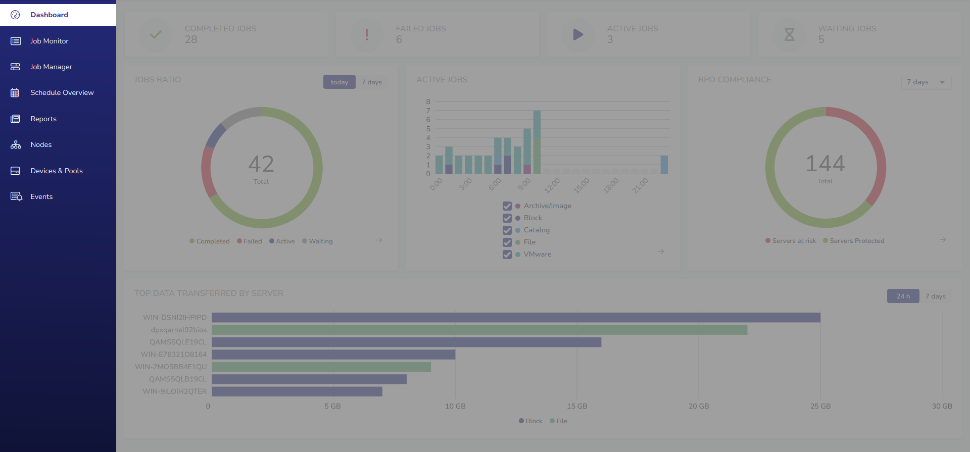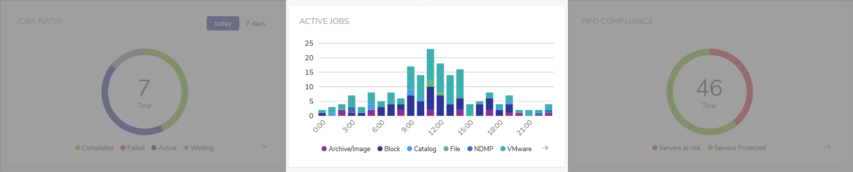 This section consists of four widgets indicating, respectively, the number of completed, failed, active and waiting jobs on the current date. The widgets are clickable and will take you to the Job Monitor view with appropriate filters applied.