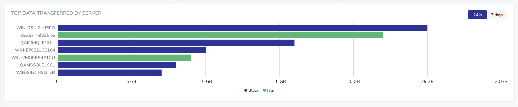 This informative widget displays top data transferred within the Enterprise in an easy-to-read bar graph. Use the toggle in the upper right corner to switch between today’s and 7 days’ data.