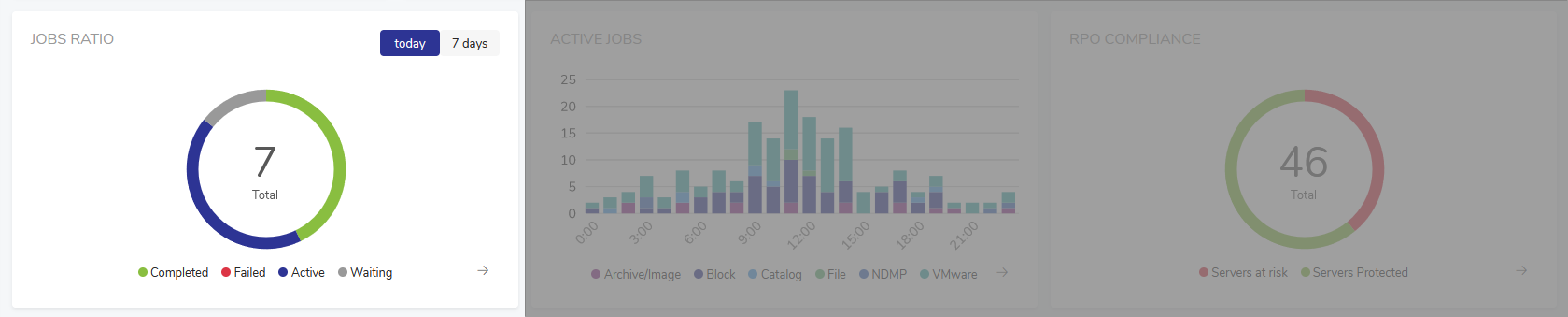 This widget shows the proportion of protected and unprotected nodes based on the RPO Compliance Report from the last 7 days. The arrow in the lower right corner will take you to the RPO Compliance Report in the Reports section.