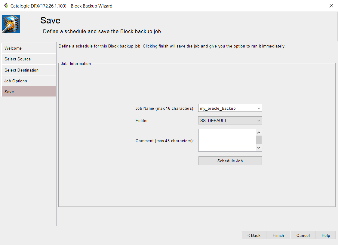 - In the final Save step, you must enter the Job Name (max. 16 characters) and specify the Job Folder to store the job in (the default folder is SS_DEFAULT). You may also add a comment to the job definition or set up a schedule (See Scheduling a Block Backup Job).