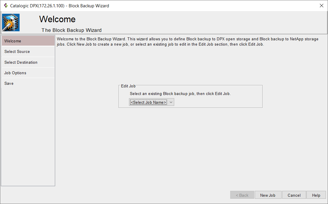 - By default, the creator allows you to select from the drop-down list and edit an already existing job. If you want to create a new block backup job, click the New Job button in the lower right corner.