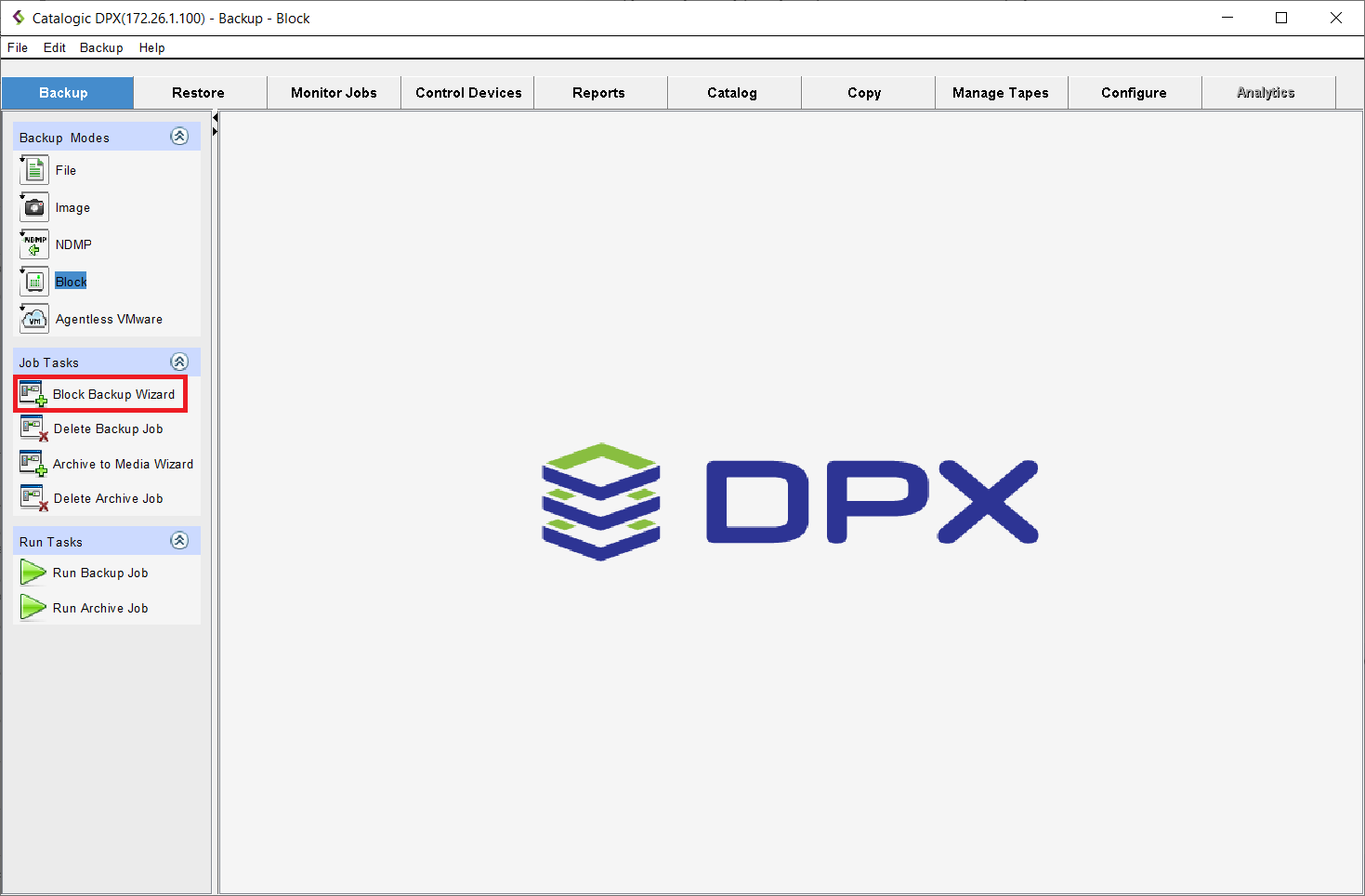 - In the Job Tasks section of the task panel, find and click Block Backup Wizard.