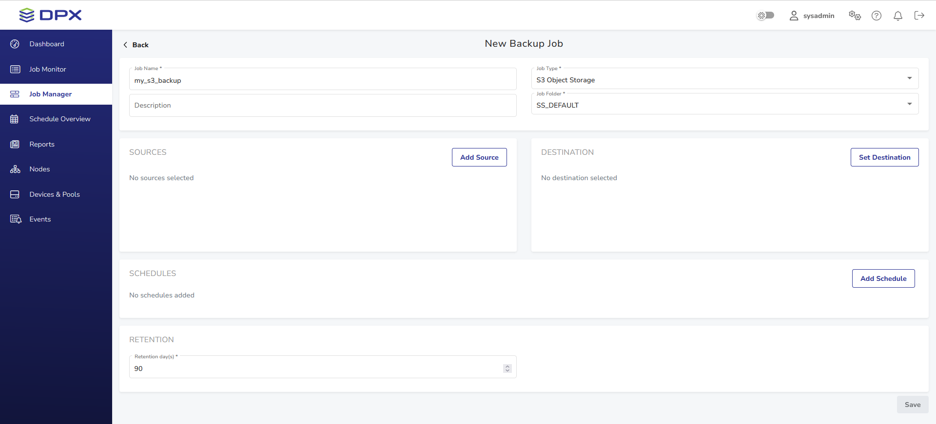 You may also select the Job Folder to store the job in (for more information, see Job Manager). By default, all jobs are stored in the SS_DEFAULT job folder. - Specify the Job Name. For S3 Object Storage Backup, this field may contain no more than 64 characters.
