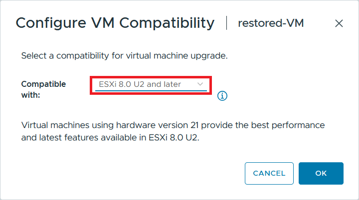 When performing a full or instant VM restore, the VM hardware version in the target vCenter is set to the vCenter’s default value, which may prevent the VM from starting. You may use Multi-VM Restore in the web interface to avoid this issue.