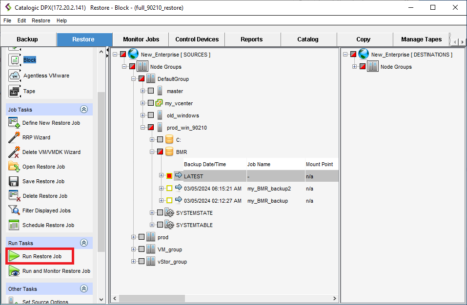 1. In the Sources pane, drill down to find the BMR backup within the node you want to restore.