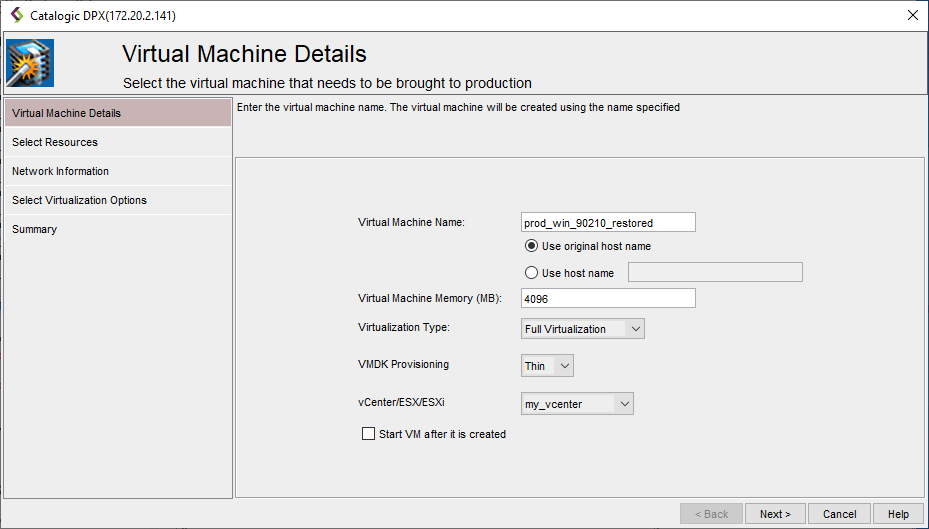 1. In the Select Resources step, specify the Host, Datastore, Resource Pool/VApp, Network, iSCSI Adapter and the VM Folder where the new VM will be logically located. Click Next.