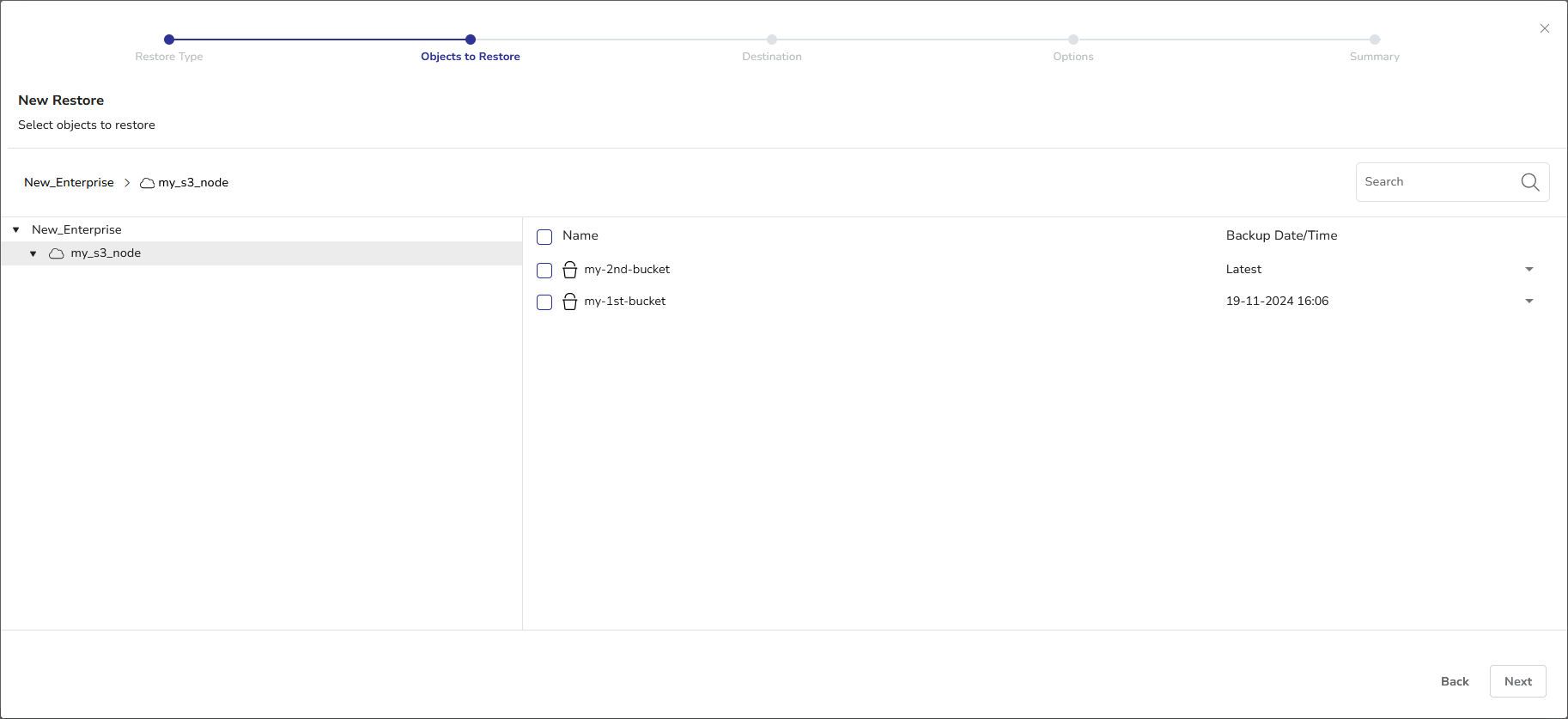 - The Objects to Restore view shows all buckets backed up using DPX S3 Object Storage backup. You can sort the buckets by Name or use the search field to find the required items.