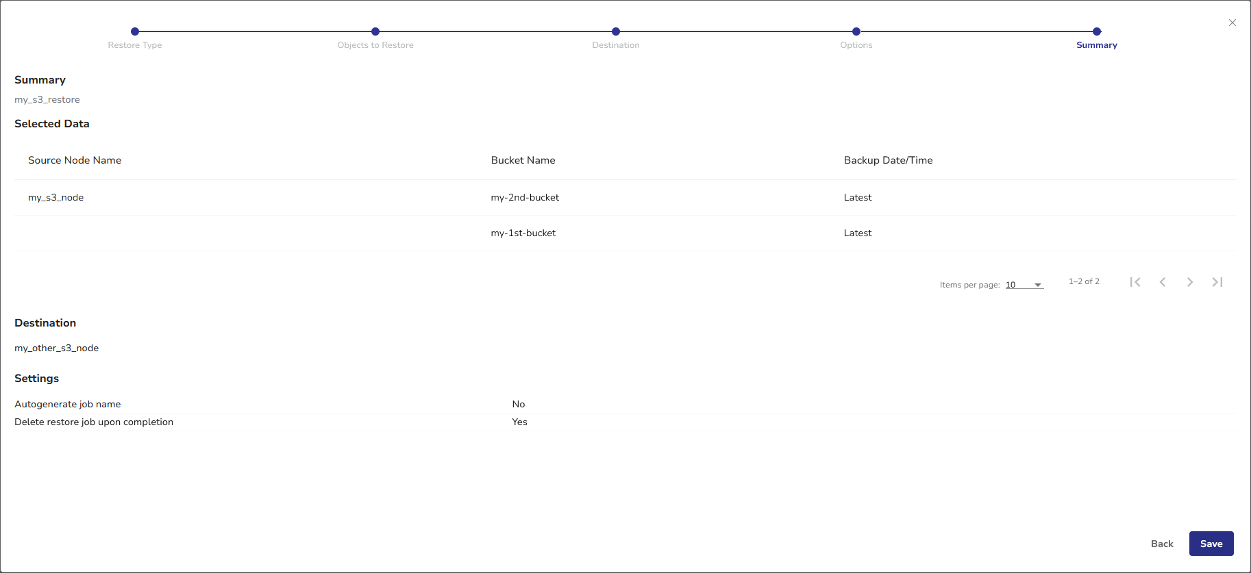 - In the Destination step, use the drop-down menu to select the S3-compatible node name where you want to restore your buckets.