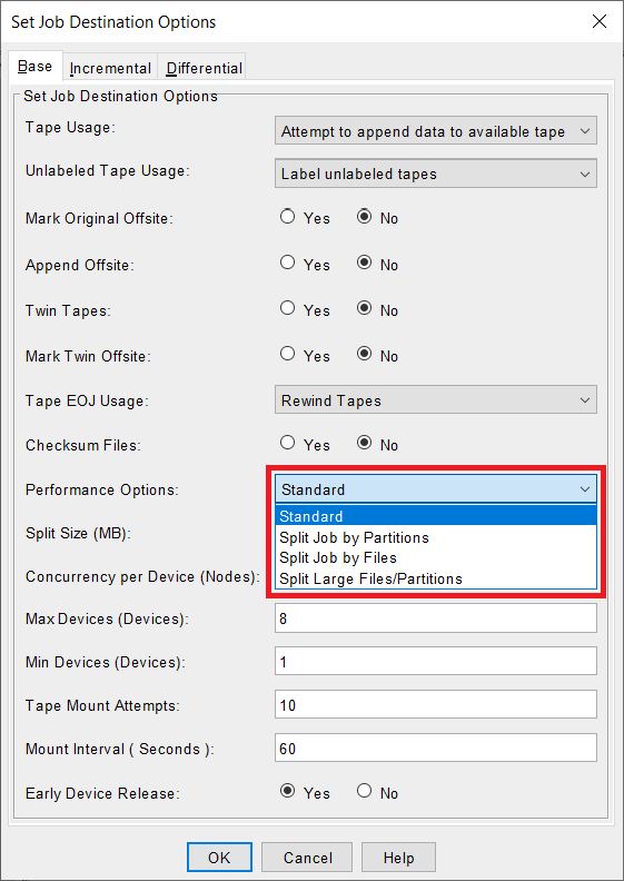 | Split Job by Files | Use this option when backing up single partitions (disks or volumes) that contain many files. This selection will create a task for every available tape drive in this job. Note. This option is not supported for Linux OES. |