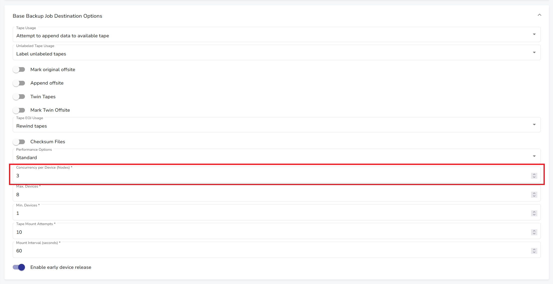 - Change the value in the Concurrency per Device field to different from 1. This field sets the maximum number of file backup tasks to a single device.