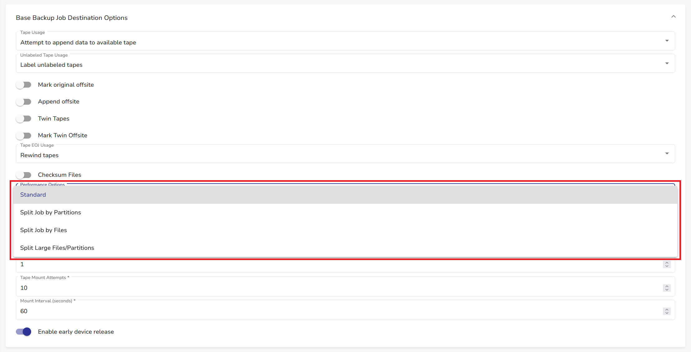 - Select a value from the Performance Options dropdown. This option helps control the number of concurrent tasks within a backup job.