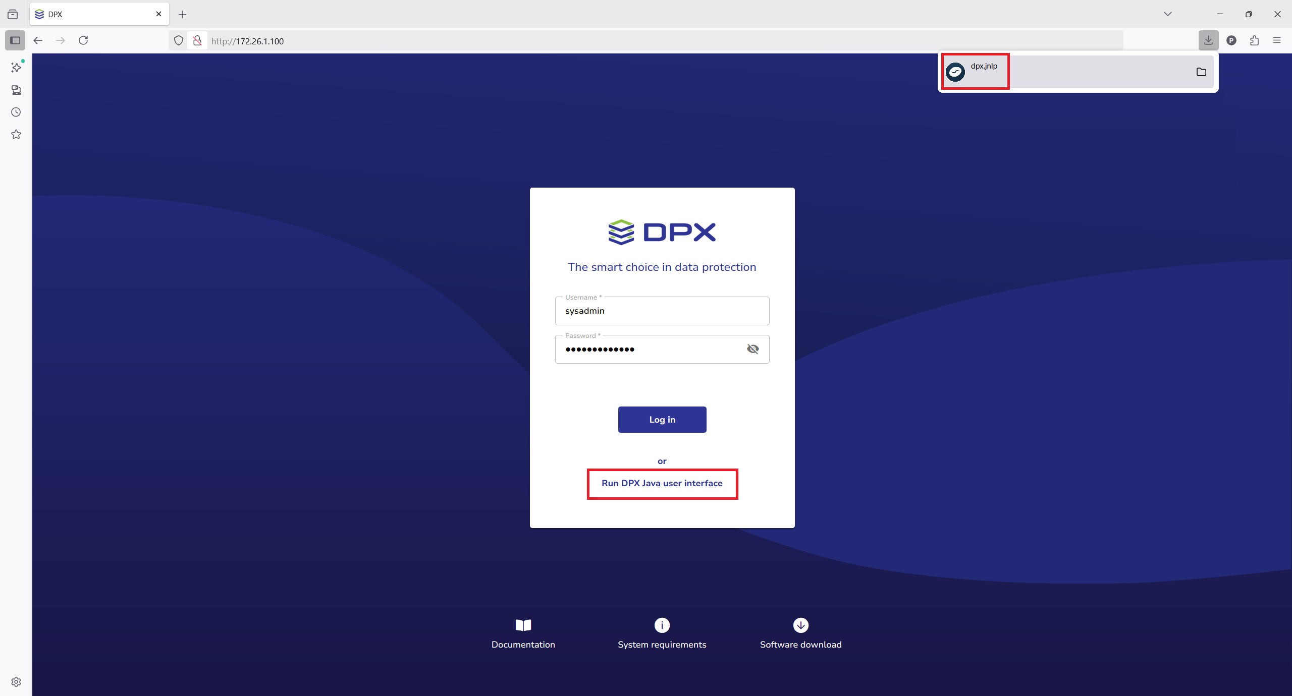 - If you are launching the desktop interface for the first time, select Run the DPX Java User Interface. This will start the download of the dpx.jnlp file which is used to launch the desktop interface app. If you already have the file downloaded, proceed to step 2.