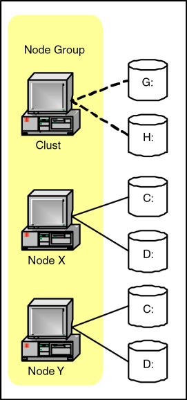 The following illustration shows a logical representation for the cluster depicted in the topic above. You define two physical nodes (Node X and Node Y) and one virtual node (BEXClus). The virtual node contains all the shared resources (G: and H:). Logically then, the cluster node group simply contains three nodes: Node X, Node Y, and Clust. Each of the three nodes contains two disks.
