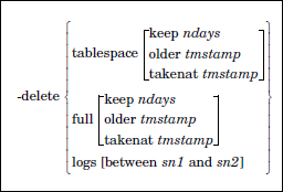 Expires backup objects or deletes log archives on the server. The syntax for -delete is: