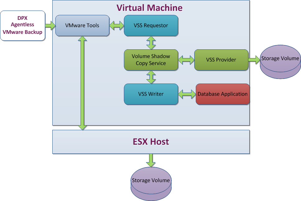 Catalogic DPX uses VMware tools that direct the Microsoft VSS to invoke the snapshot process and quiesce the VSS-aware applications. VSS interfaces with the applications and Windows OS to quiesce all of the transactions at a specific point-in-time. The triggering of VSS writers starts a VSS freeze and halt the transactions of the database application to create a consistent view of application data prior to taking a VM snapshot. Using the VSS writer, the data for the application is in the same state as if the application was closed normally. This ensures that there are no unfinished database transactions or incomplete application files during backups. See Backing Up VMware VMs.