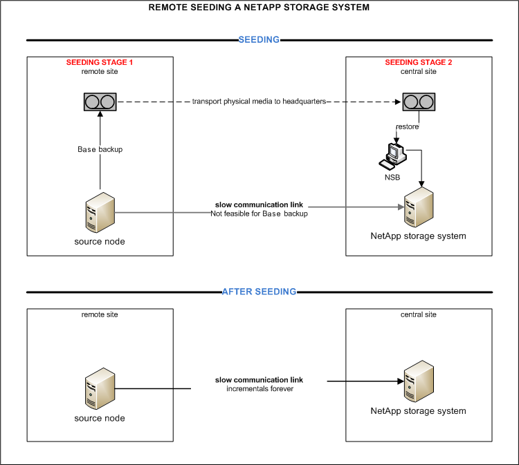 The Remote Seeding function solves this problem. It allows for remote block-level backups over very slow connections that would normally take a prohibitive amount of time. The process involves a base backup to a locally attached tape or portable hard drive. The media is then transferred through physical delivery (for example, FedEx, UPS, etc.) to a site running a NetApp storage system. This base backup is then restored to the NetApp storage system, after which incremental backups continue over the slow Internet connection. Once the first incremental backup is complete, the data is available for recovery.
