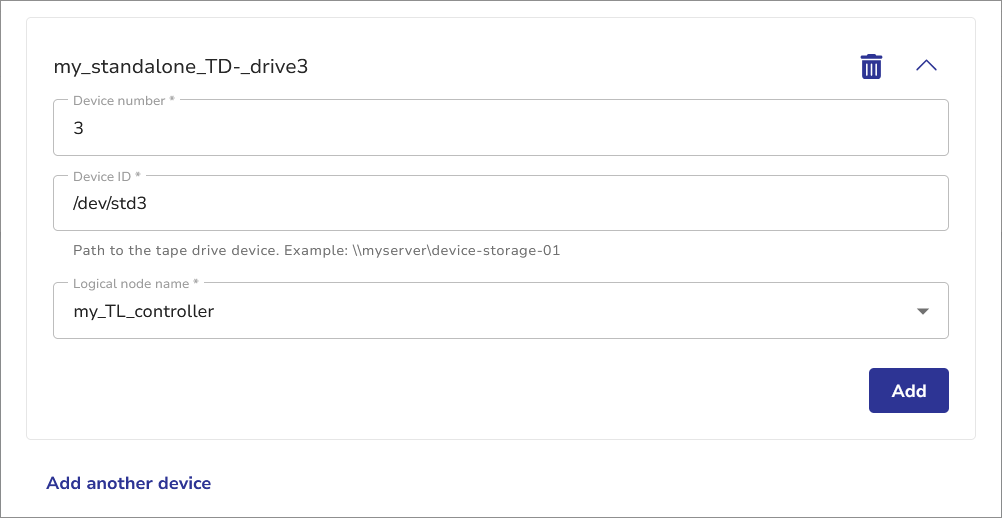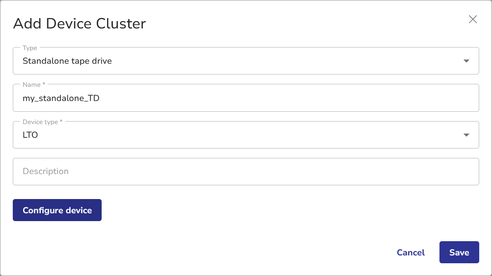 Adding a standalone tape drive has a dedicated procedure in the web interface. To add a standalone tape drive through the desktop interface, go to Adding a Device Cluster – desktop interface and select the appropriate Device Type.