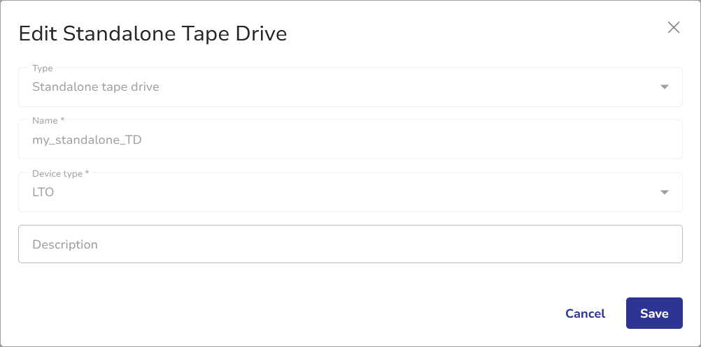 Only Description is editable. To edit other fields, delete the standalone tape drive and add it again from scratch.