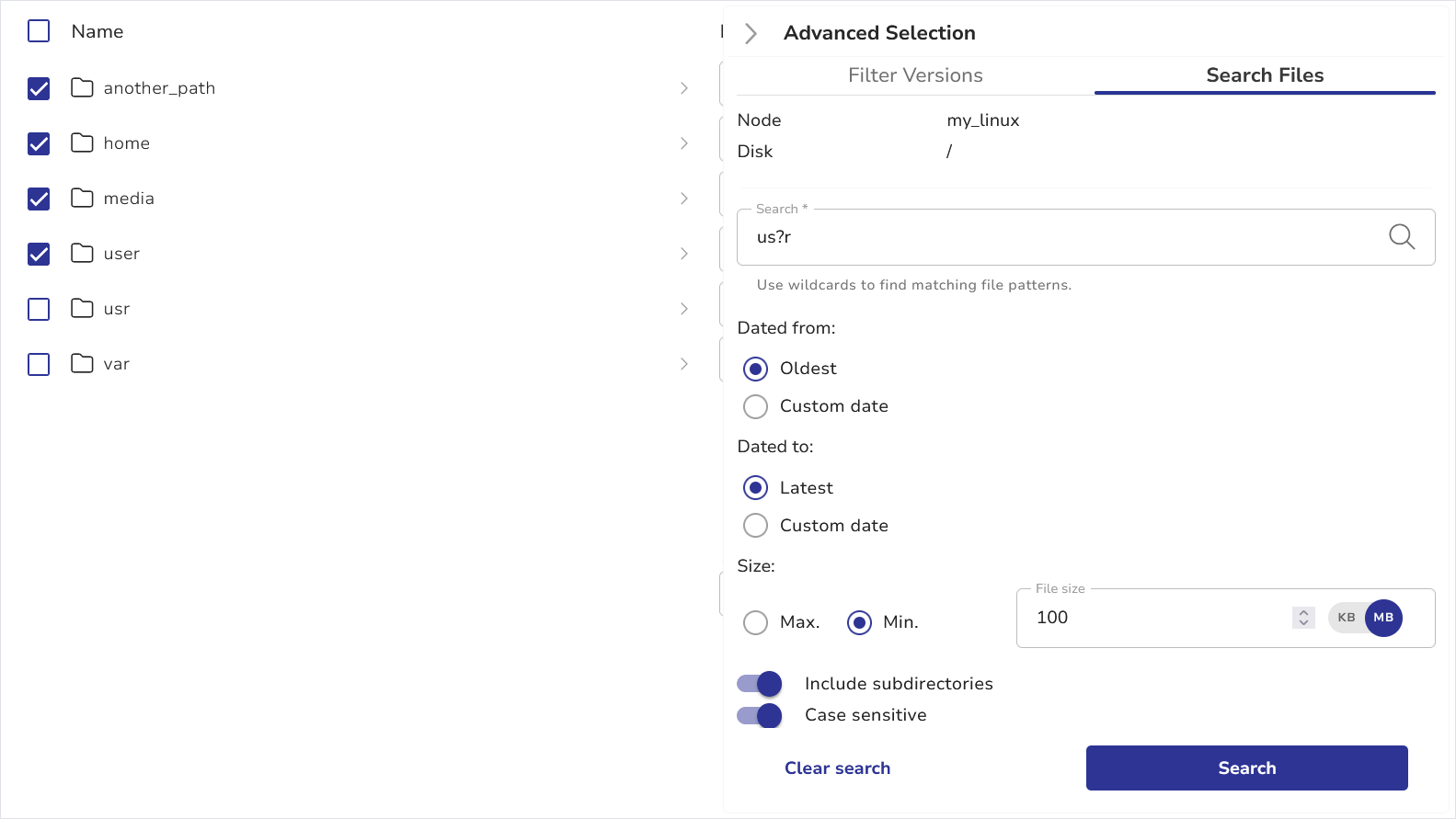 You can customize your file search criteria using the Advanced Selection slider (see below).