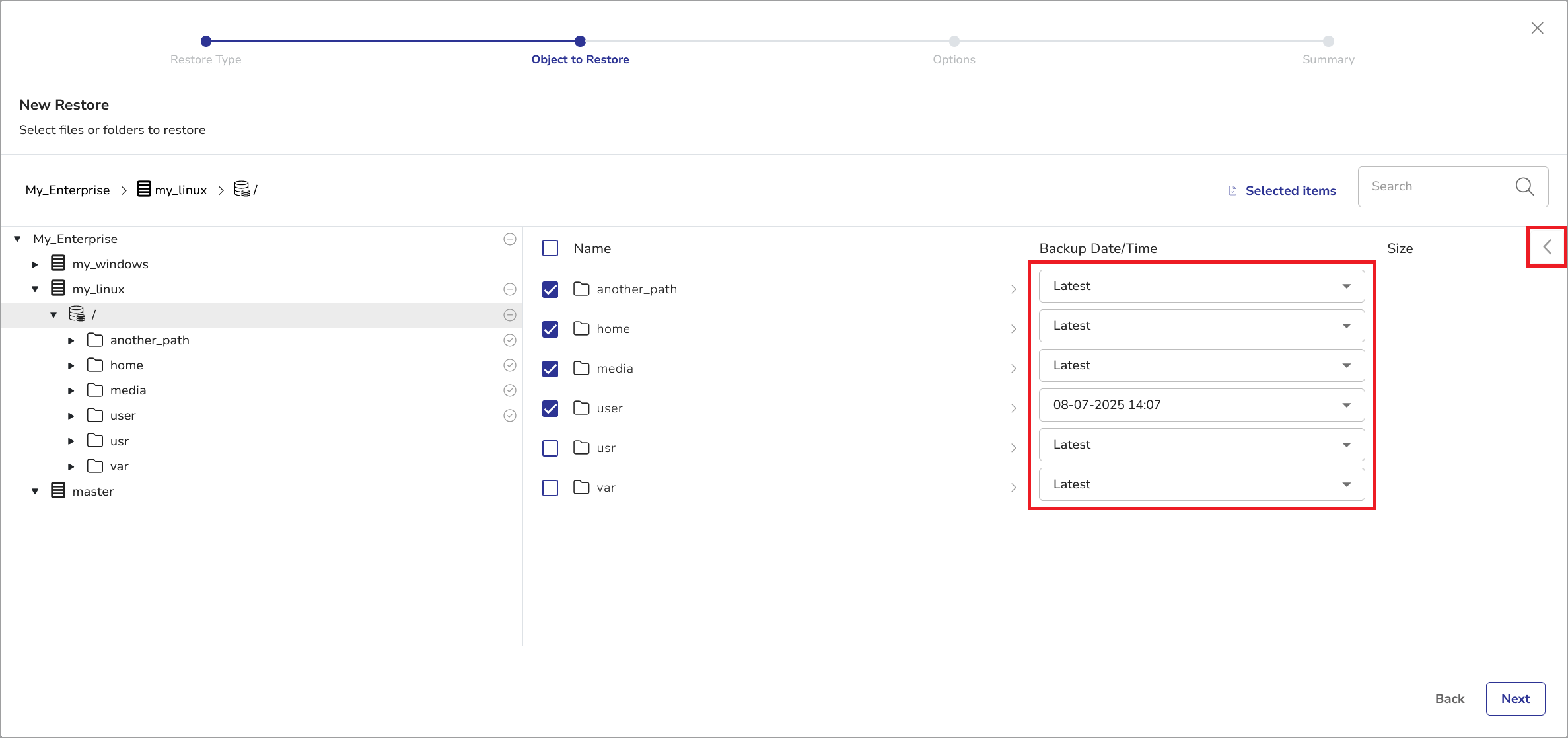 • Use dropdowns in the Backup Date/Time column to choose an earlier backup version (if available).