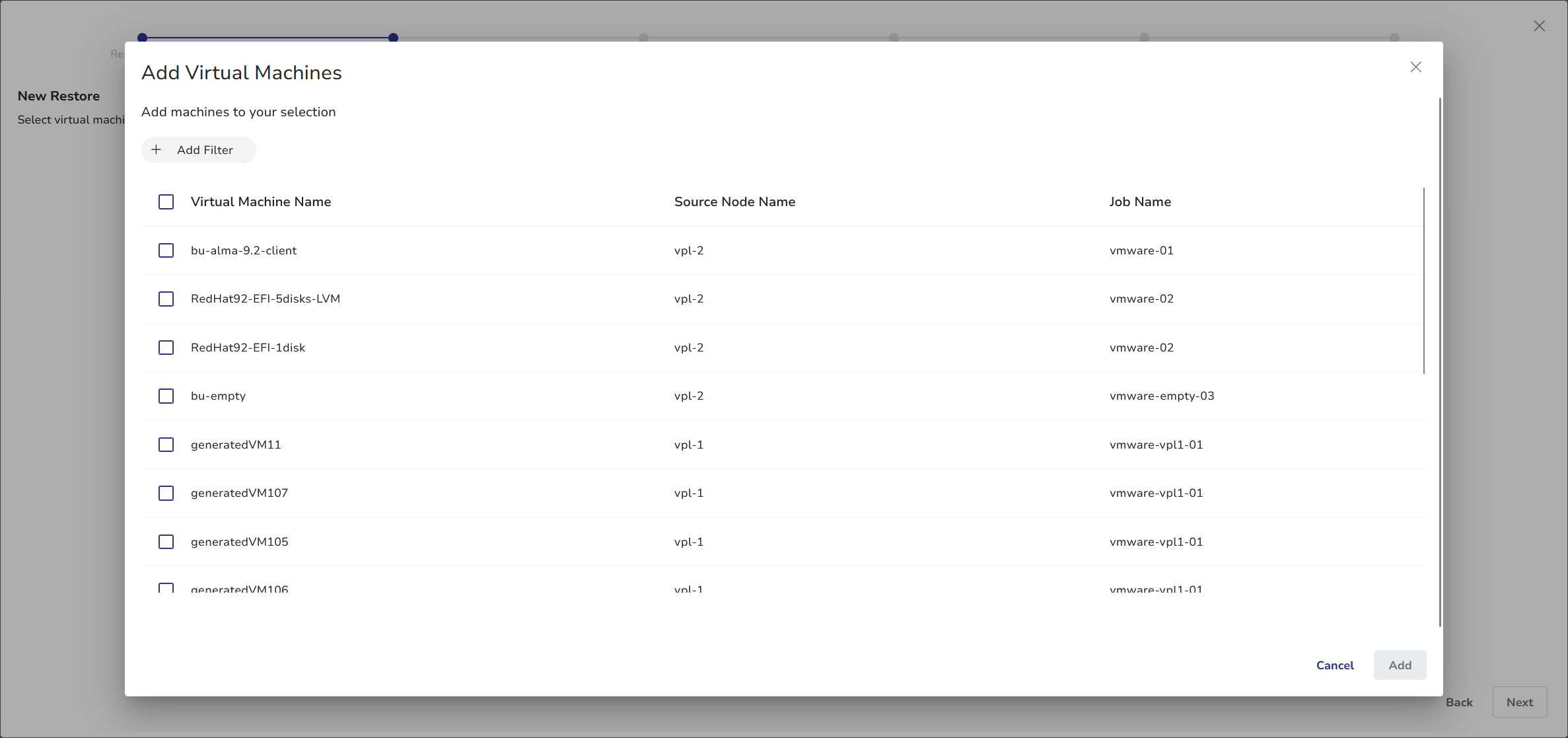- Select the virtual machines you want to restore and click Add.