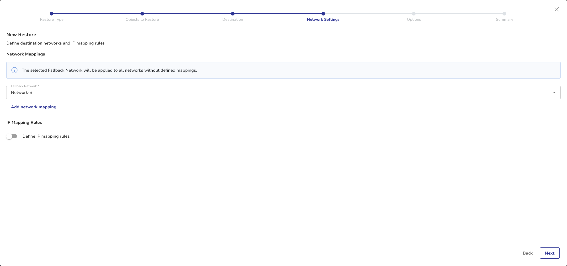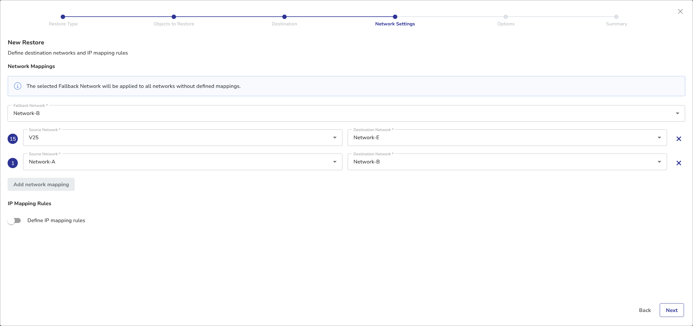 One of the networks available in the target vCenter is selected as the Fallback Network, i.e. all virtual machines without network mapping defined will be restored to this network. You can change this setting, by choosing another available network from the Fallback Network dropdown.