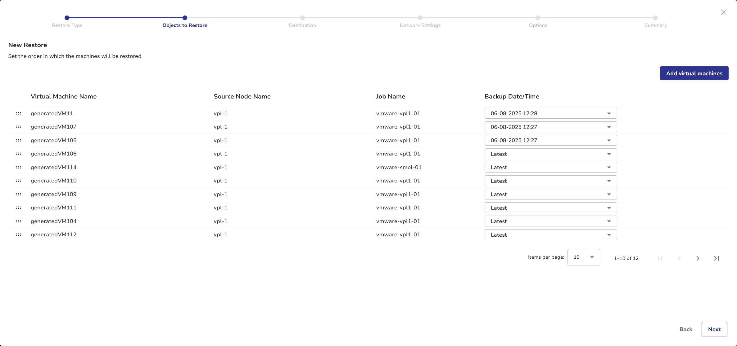 For optimized performance, VMs are restored one at a time rather than simultaneously. The order of the VMs in the list reflects the order in which the machines will be restored. To change the order, see Change Virtual Machine Restore Order below.