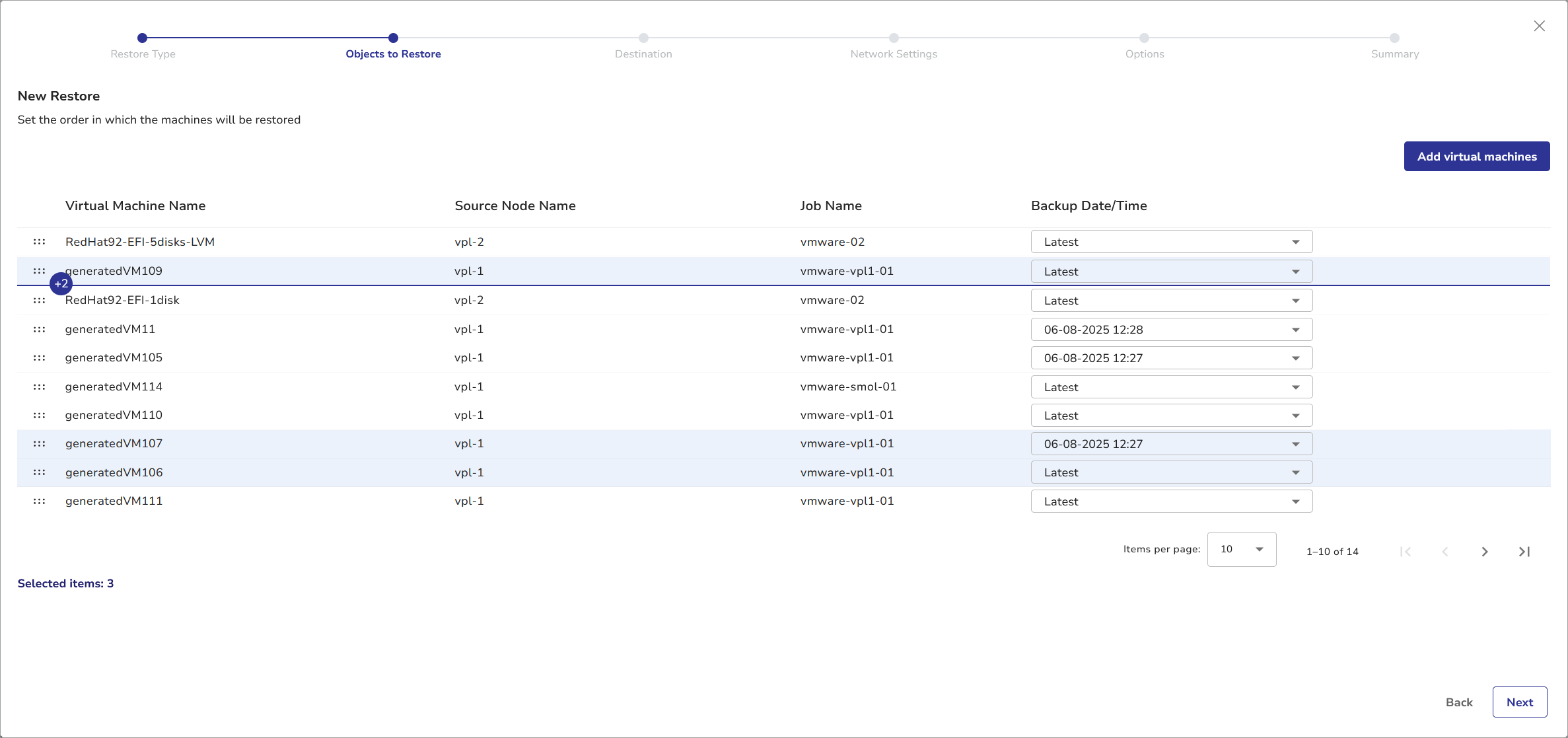 - Use the Backup Date/Time column to select the recovery point (version) of each machine. By default, the latest version is always restored.