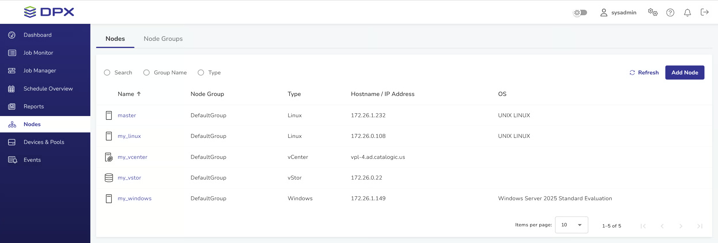 - Search filter allows filtering with a substring within any of the displayed attributes, such as Name, Node Group, Type, Hostname / IP Address, or OS. Wildcards are not supported.