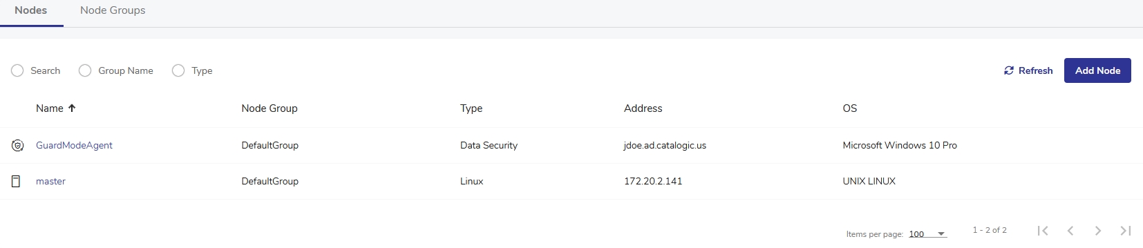 Nodes protected by the GuardMode Agent are categorized as Data Security type. The node name is based on the DNS hostname of your VM, or if you're using a Windows Server, it's the name of the machine where the Agent is installed.