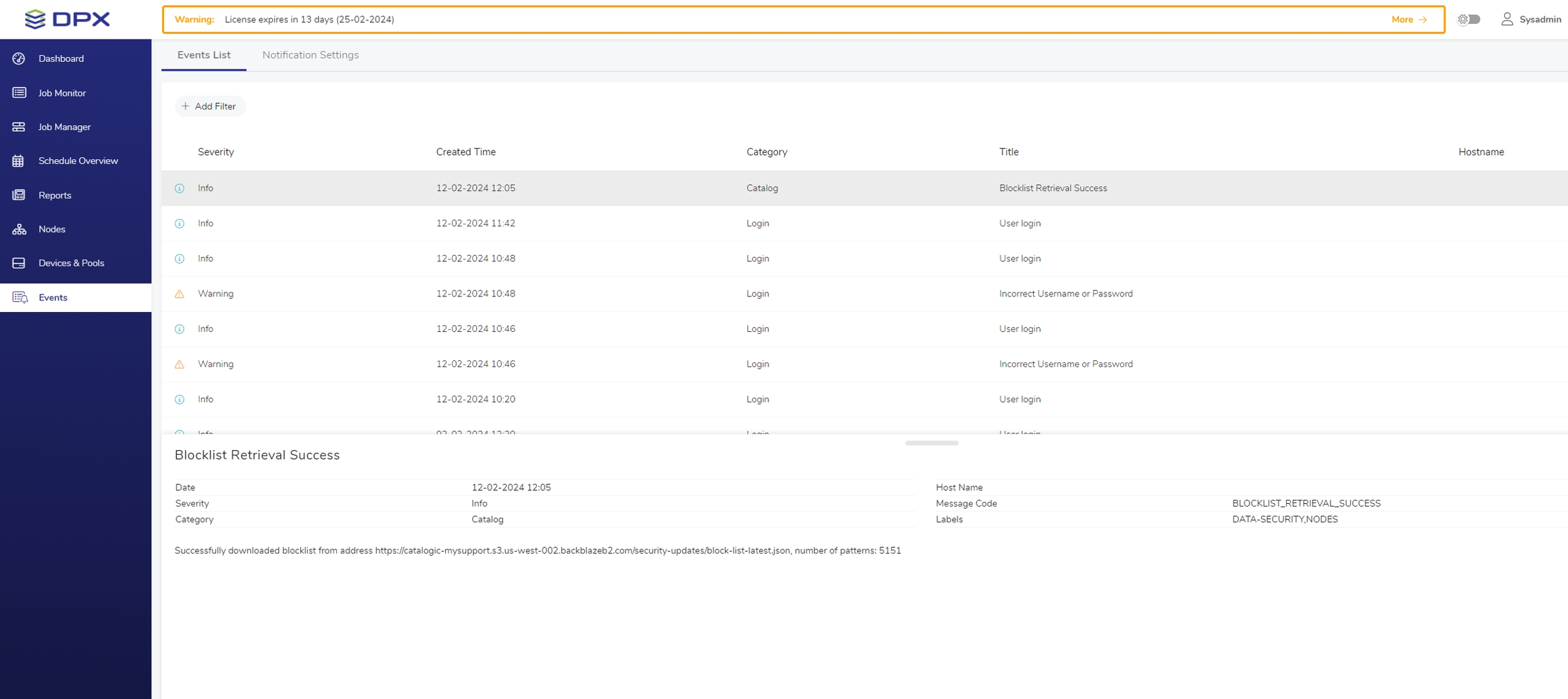 Once the services are running again (this may take a few minutes), check the Events section in the DPX Master Server web interface to verify that the blocklist has been downloaded.