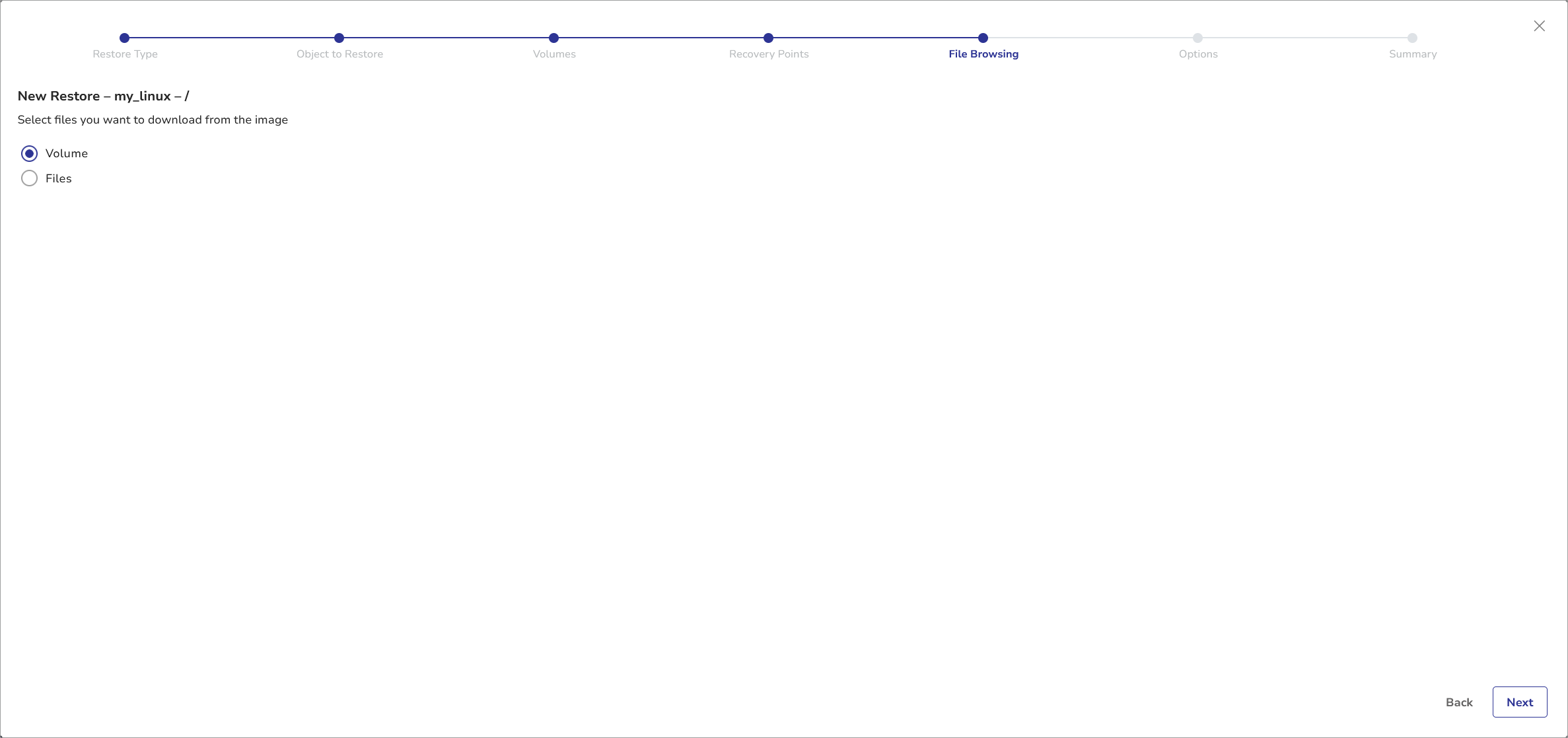 - Select the entire volume (default) or individual files to restore from the backup. Click Next.