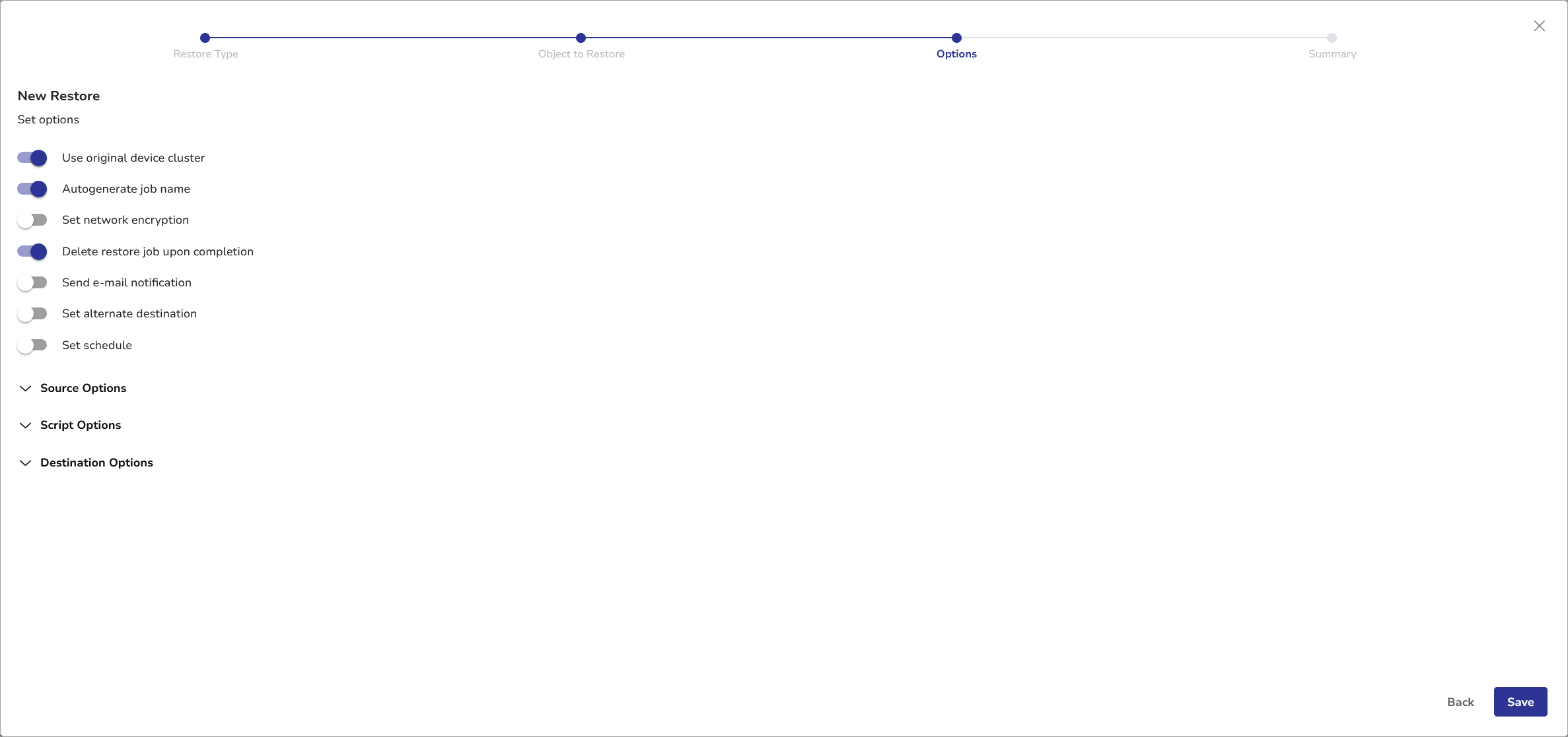 - Leave all options at their default, and click Save. The restore job definition with a default name will be created.